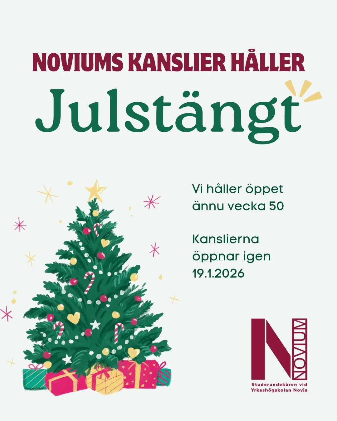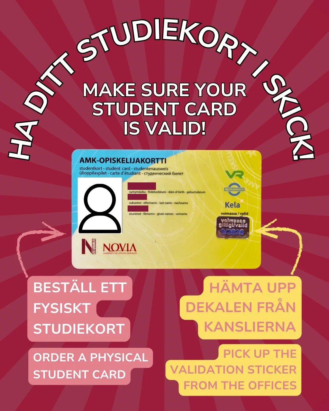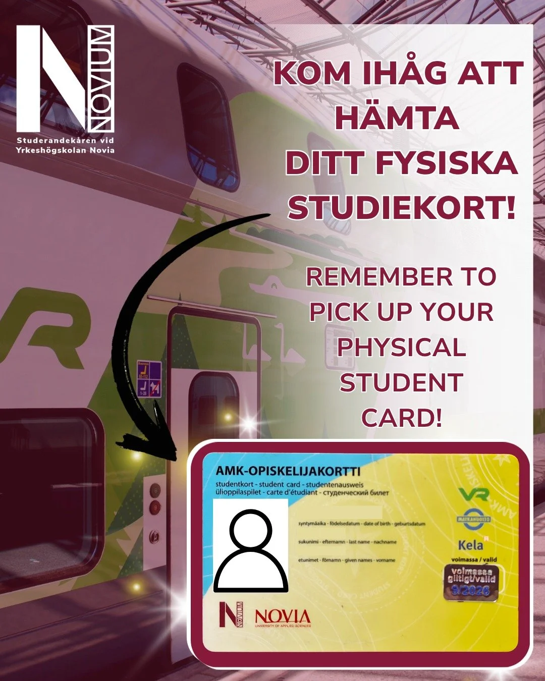 Som studerande kan du ta del av flera fina förmåner när du är medlem i Novias studerandekår, Novium. Bland annat kan du som medlem i Novium beställa ett gratis, fysiskt studiekort som ger dig billigare tåg- och bussbiljetter med VR och Matkahuolto, samt Kelas måltidsstöd som innebär att du får billigare mat i studeranderestauranger vid ditt campus.