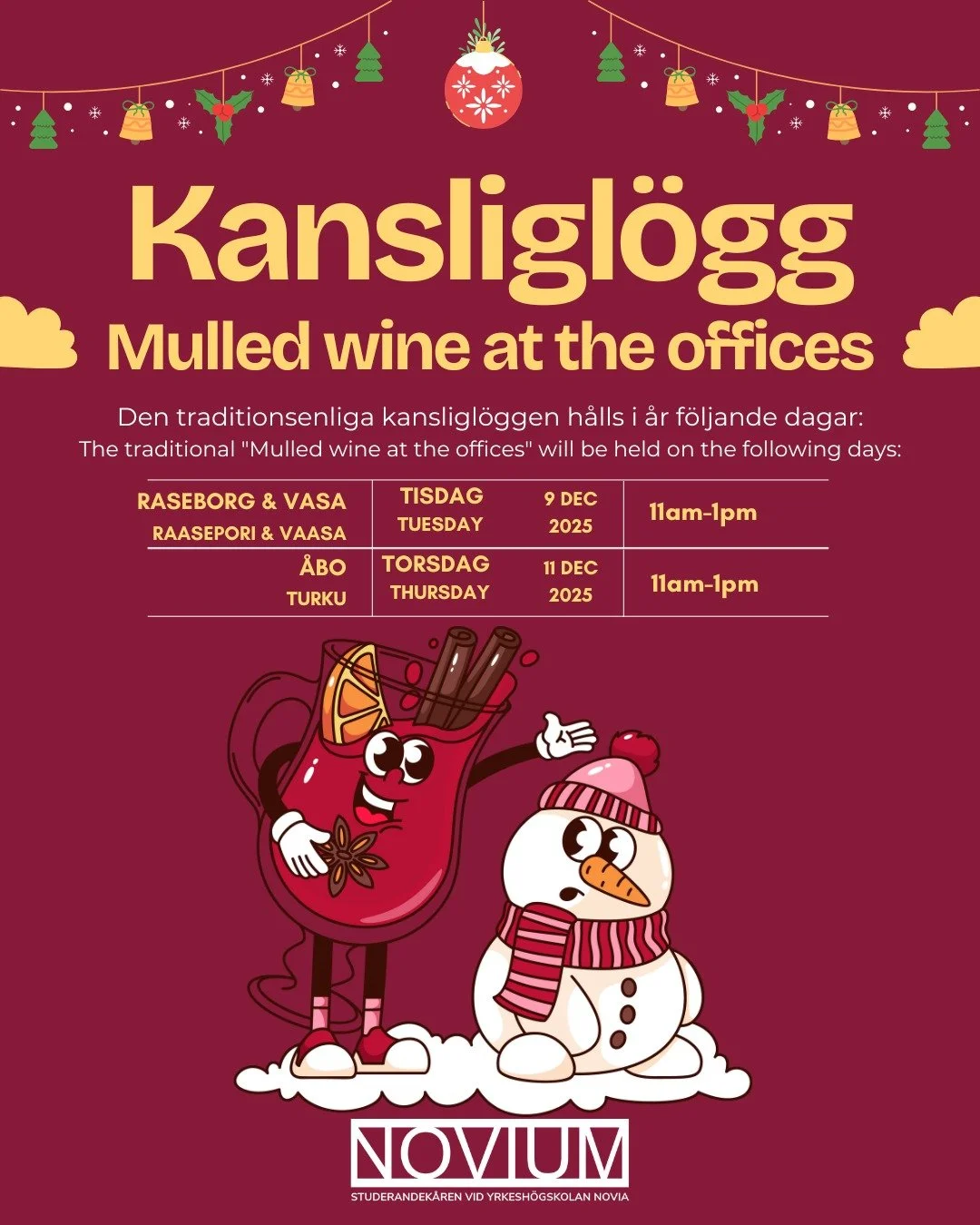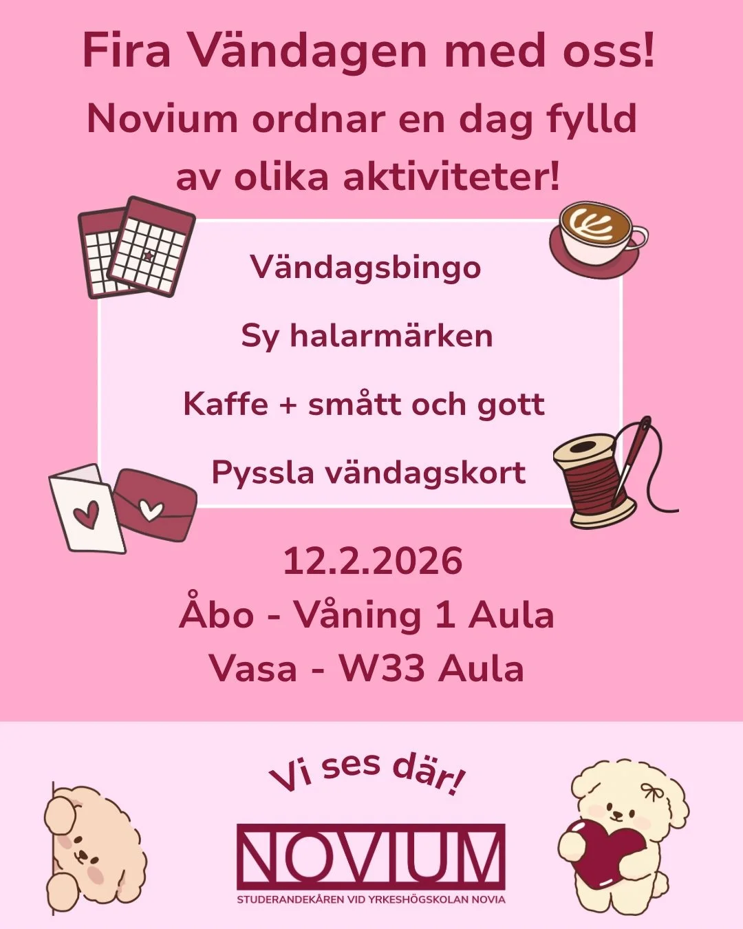 Novium är studerandekåren för alla studerande vid Novia. Vi bevakar studerandes rättigheter och arbetar för att alla ska bli rättvist behandlade. Dessutom vill vi att alla som studerar vid Novia får en god utbildning, njuter av studietiden och mår bra. Vi tar väl hand om våra medlemmar och hjälper dem med allt mellan himmel och jord.