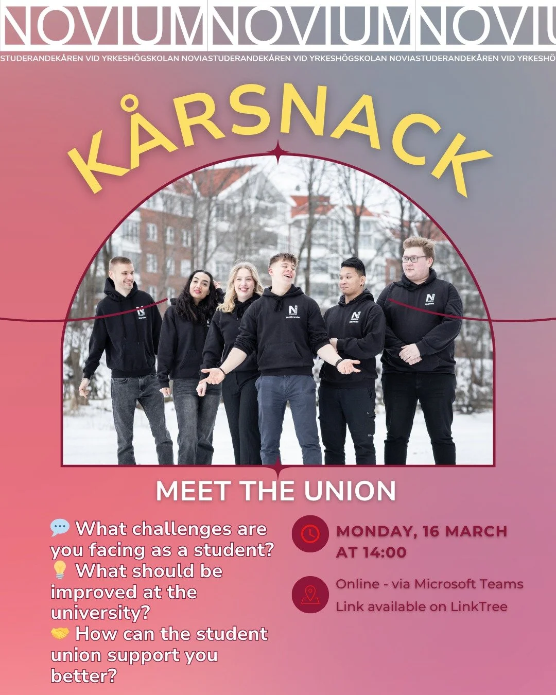 Tillsammans kan vi driva igenom förändringar och förbättra studievardagen för alla studeranden vid Novia. Genom att rösta i kårvalet/ställa upp i kårvalet kan du påverka din och andra studerandens framtid.